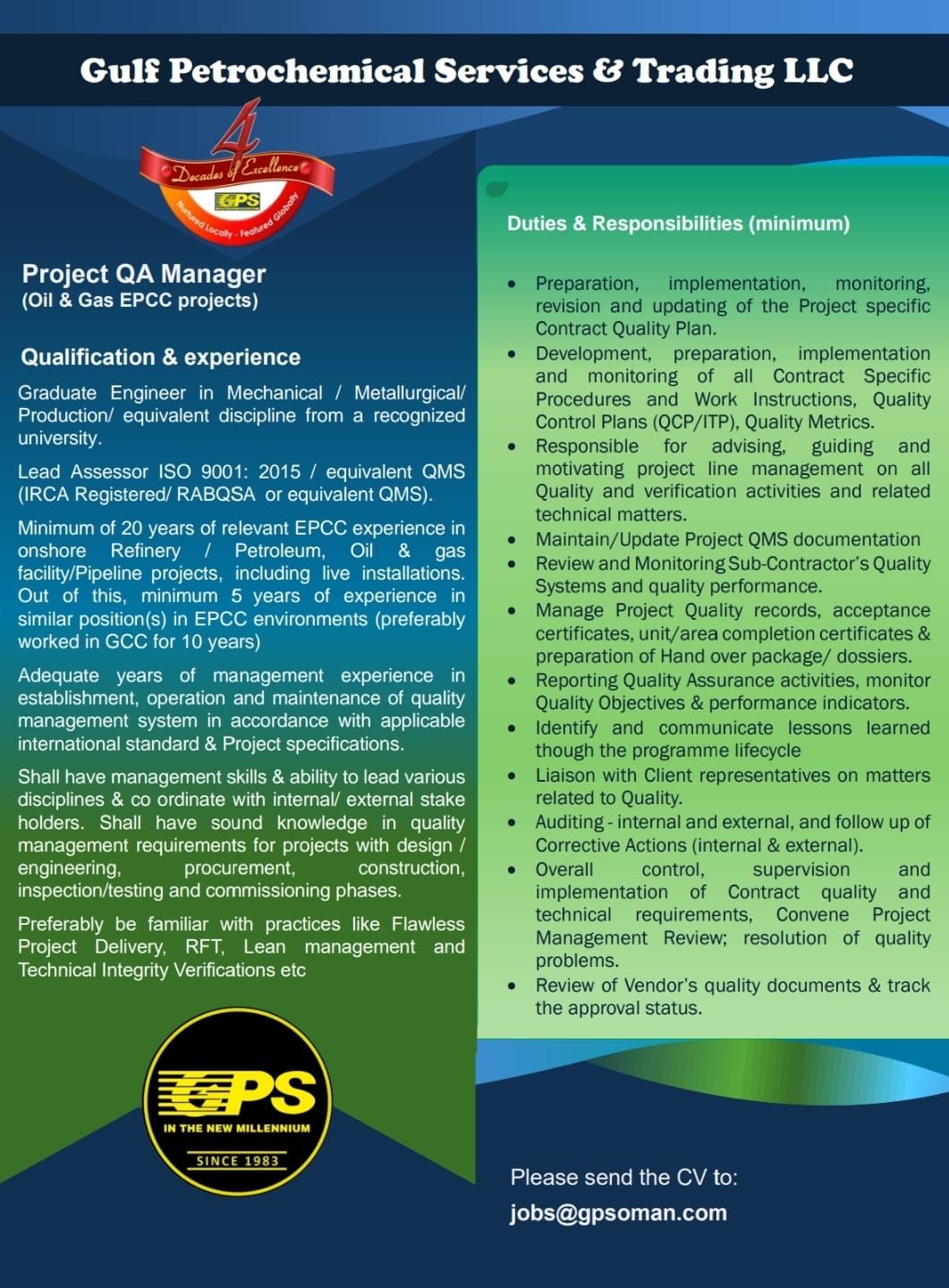 حددت شركة GPS مجموعة من الشروط والمتطلبات الأساسية لشغل الوظيفة، وتشمل: