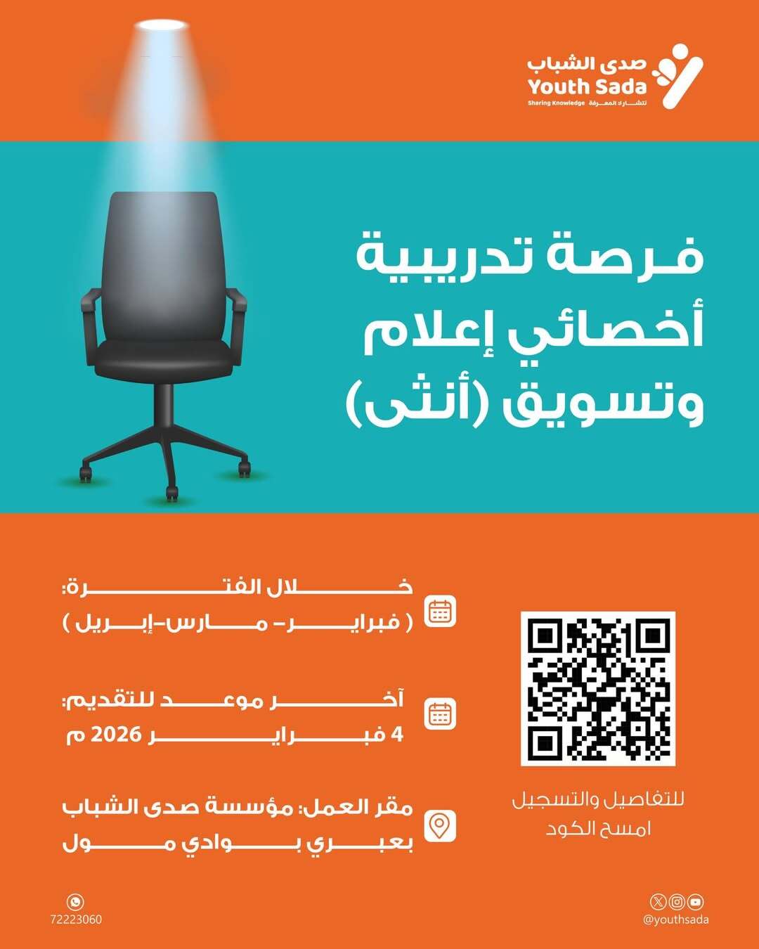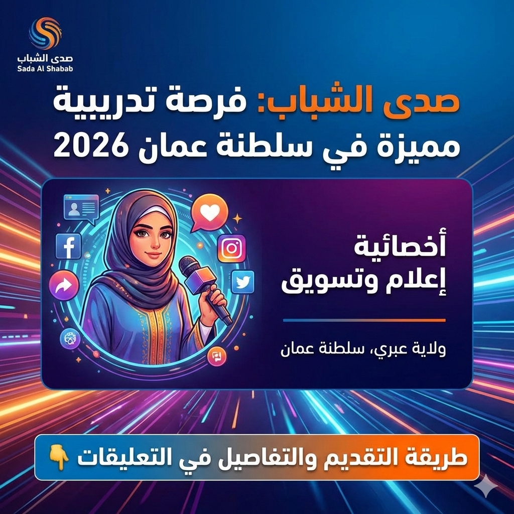 أعلنت صدى الشباب في ولاية عبري عن إتاحة فرصة تدريبية بمسمى أخصائية إعلام وتسويق، وذلك ضمن برامجها الهادفة إلى تمكين الكفاءات الشابة وصقل مهاراتهن العملية في مجالي الإعلام والتسويق . وتُعد هذه الفرصة مناسبة للخريجات والمهتمات باكتساب خبرة ميدانية حقيقية في بيئة شبابية داعمة وبدشح بناء على ما تم الاعلان عنه رسميا من الجهات المختصة .