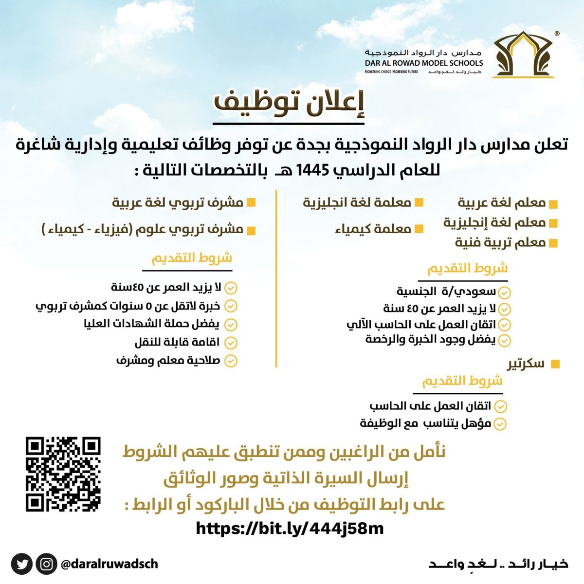 مدارس دار الرواد النموذجية بمدينة جدة السعودية أعلنت مؤخرا عن فتح باب التقديم للراغبين في الحصول على وظائف مختلفة سواءا تعليمية أو إدارية وذلك للرجال والنساء وفق شروط ومسميات سنوافيكم بها في سطور هذه المقالة بالتفصيل نبصوس بناء على ما تم الاعلان عنه رسميا من الجهات المختصة .